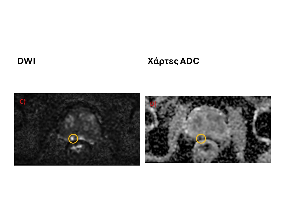 - Λειτουργικές ακολουθίες διάχυσης (DWI/ADC); Αποκαλύπτει περιοχές όπου η κίνηση των μορίων νερού είναι περιορισμένη, ένδειξη συχνά κακοήθειας. Οι ύποπτες εστίες συχνά δείχνουν περιορισμό διάχυσης και αυτό μπορεί να συσχετίζεται με πιο επιθετική νόσο,