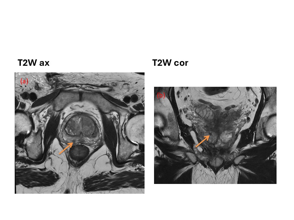 T2-weighted images in the axial (a) and coronal planes (b) demonstrate a small lesion (5 mm), of low signal intensity, located in the peripheral zone of the prostate gland (arrow), PI-RADS: 4.